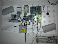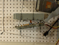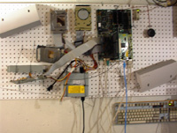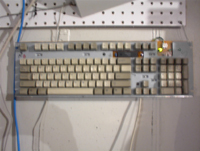 Before I get to the Hard Drives, let me tell you all about the other addition to the pegboard: the keyboard. I decided to head back to the used parts store and pick up a keyboard to dismantle. I have come to really enjoy the lack of cases on this computer, I don't have to clean up other people's um, stuff, from the side of the cases. This held true with the keyboard which must have had labels galore before I got it. Anyway, I unscrewed about six screws, undid a few clips and presto! That's all there was to it! I tried removing the aluminum/cardboard shield from the back, but the circuit board would probably damage something with its pointy solder... The only circuits that show now are the LEDs for the various locks and a 2 (two, dos, deux, zwei, due, dois) inch long chip with few other components scattered around it. Not the most exciting part on the board, but it looks nice hanging there. |