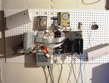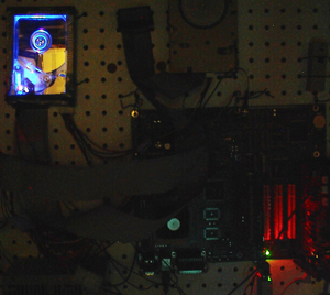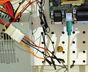 I finally figured out what I could change on the pegboard computer! It didn't have lights! How could I use it when the lights were turned off? Instead of doing something wussy like turn the lights on, I decided to strategically place a few lights on the board. Everyone likes lights right? Right? First thing I did was test the voltage coming out of the power source. As you can see in some of the pics below, there are four wires in the standard configuration. Two are black grounds (in the center), one is red (5V), the other is orange (12V). Along the way, I found out that you can perform a really hard shutdown by shorting the orange (yellow in some PCs) and the red! That probably isn't the healthiest thing for me to do to the computer, so I decided to stop shorting things before I damaged my $30 ATX power supply. That would be a truly tragic event.