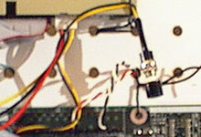 The next couple of lights I placed were next to the PCI cards. One faced forward through a hole in the motherboard. I nestled the other LED in between two chips on the video card facing upwards. The next light was placed above the CD-ROM's controller card facing down. I mounted the two blinking lights behind the speakers so that the light would be diffused somewhat by the curved surface of the speaker. Next came the fun part, I got to solder all the LEDs to the power source. For the first part, I bought an extension for computer power cords and cut it in half. I then cut and stripped wires in the appropriate sizes and weaved them through the pegboard to their respective destinations.