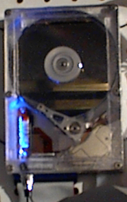 The next thing I did was build a Lexan shield for the HDD to replace the duct tape and jewel case window that was currently protecting the HDD. I did this by making Sears Hardware cut strips of Lexan sheeting to the right lengths and then gluing them together with "Amazing Goop." I then let the Goop (which causes cancer in CA, so it's best not to use it there) set overnight for maximum bond strength (which is about 24 hours longer than I have patience for). Anyway, I used a Sears drill press to boldly drill multiple small openings at strategic positions in the Lexan lid. When this was done (surprisingly without melting the Lexan) I decided to implement a bold strategy of systematized incremental removal of plastic from the edges of the object in order to create a more refined product. In other words I took a grinding wheel to it. Again the Lexan didn't melt, totally amazing me (since I have only worked with soft plastic before). I even found long screws that fit the HDD so I could fit the lid on without tape, a new concept for me... After the lid was tightened, I took some foil tape (which looks cool) and sealed the HDD with it (so it would look cool). Along the way I inserted the blue LED again. Time to look at more pictures!!!