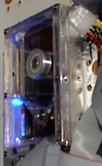 A week later disaster struck, the controller card on the HDD cut out. If I wasn't using the computer the next day for a LAN party it wouldn't have been so bad, but I was and it was. The #%&@*!$ thing just kept slamming the armature back and forth against the stops. Some people think Zip drives have a click of death, but let me tell you, they don't know a thing about deadly clicks... I ran out to CompUSA and bought a new Western Digital 30GB (I had to restrain my better judgment to favor this unit) drive for one penny more than the 20GB drive, go figure... So I ended up with six times the storage and a magic see-through clicking HDD from this ordeal... At the super caffeine LAN party the PbC performed flawlessly by playing Serious Sam, Quake III, No One Lives Forever, Soldier of Fortune, and Elite Force. Just recently I added another 128MB of RAM to the 64 I had put in originally so its up to 192MB now.
