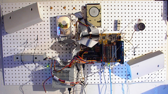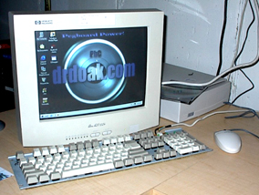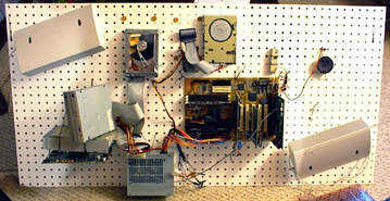 So, I took the board off the wall and set to work removing everything that I spent hours putting on not all that long ago. After about 15min pulling stuff off, I decided it would be a good time to place objects back on the pegboard. Since I have so much experience with tying objects to the little holes in the board this was accomplished in about 42 seconds (give or take...). With the help of two stout men manning the block and tackle we wrestled the computer back into its place on the basement wall. At this point I waved my hand and spawned a 15" HP monitor (with stand) below the PbC on the desk. Neat, huh? As a final touch I removed the old CD-ROM and installed the HP CD burner I had been playing with in its place.