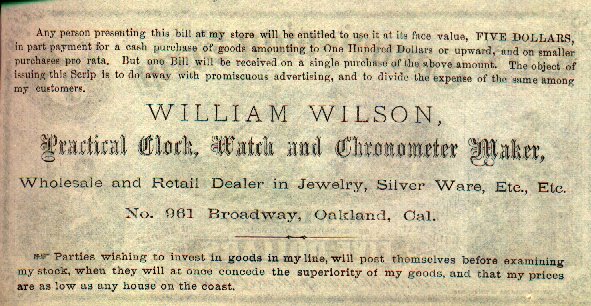 "Any person presenting this bill at my store will be entitled to use it at its face value, FIVE DOLLARS, in part payment for a cash purchase of goods amounting to One Hundred Dollars or upward, and on smaller purchases pro rata. But one Bill will be received on a single purchase of the above amount. The object of issuing this Scrip is to do away with promiscuous advertising, and to divide the expense of the same among my customers. WILLIAM WILSON, Practical Clock, Watch and Chronometer Maker, Wholesale and Retail Dealer in Jewelry, Silver Ware, Etc., Etc. No. 961 Broadway, Oakland, Cal. Parties wishing to invest in goods in my line, will post themselves before examining my stock, when they will at once concede the superiority of my goods, and that my prices are as low as any house on the coast." |