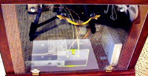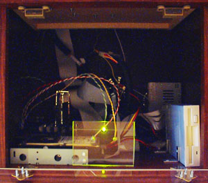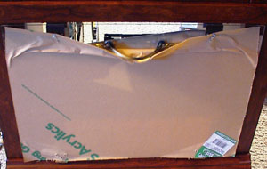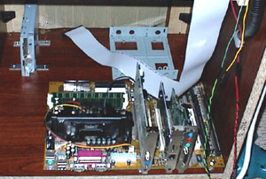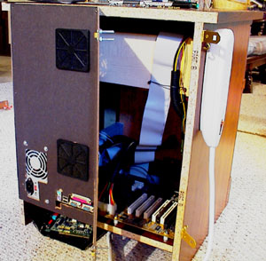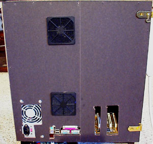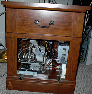 Now the backing was ready to be worked on. I had to cut holes in the thick cardboard for two fans, the power supply, and the PCI cards. This is where things get interesting... I have decided that I really, REALLY hate that stuff... I spent an hour and a half scratching out these ports with an X-Acto knife. Now, you might ask why I didn't use the Dremel to cut the holes (I assume you know what tools I have somehow or other...). All I have to say to that is this: I didn't think of it at the time and #$%&%$*%$@!!! Everyone I tell about this suggests that except the one person who was there at the time... I guess I need a new assistant for such things. Good help is so hard to come by these days (Note how cleverly I shifted the blame to the assistant). After that epic struggle I set about attaching the power supply and the two fans. The next part was so incredibly easy after all that... Nailing in the brads that hold the backing to the night stand. Since I planned to keep half the backing hinged to open like a door, I was able to use all the brads to secure the one side with most of the weight on it. I then drilled holes for the two brass latches and screwed them onto the night stand. The last thing I really needed to do was install the HDD and hook all the cables up. At this point I removed the paper from the window and stood back to admire all that work.