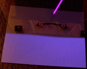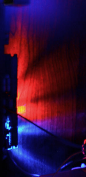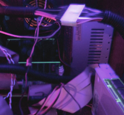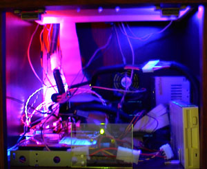 I also decided that to be a truly wonderful "case" mod it would need some lights. I ordered a black cold cathode bulb and two "Lazer LED" bundles. The black light will produce little heat and be easy to install. The Lazer LEDs are also easy to install and would provide most of the actual visible light accenting (black lights mostly put out UV light that reacts with certain surfaces like the detergent in shirts). The results were very spectacular, in my humble opinion, and as good as I could have wished it to be. I would recommend either of these to anyone looking for a good lighting solution. An interesting effect of the black light was that the upper edge of the RAM and CPU cards glow. It also had one other unexpected effect. When taking a picture, the digital camera seems to have picked up much more "black" light than I could see, even with exposure set all the way down. So, keep that in mind when you look at the pictures. The red and blue LEDs also look to be one big purple light instead of the more seperated look you see in person. |