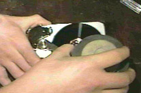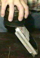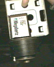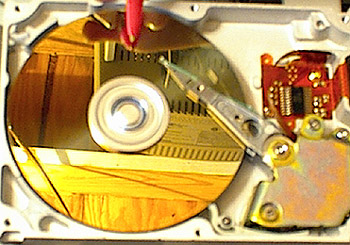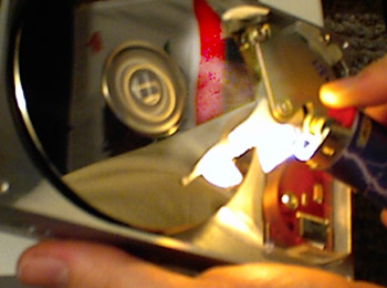 The third test involved fire. Since fire looks cool and some things burn, this seemed like a good idea. What I did was this. I pulled the cover off, then tried just holding that nice Bic flame between the platters. The flame blew out. I tried again and again the flame sputtered and died. The spinning of the mirror-like platters was creating a decent air current. I decided to try a different approach and held the lighter over the top platter. This time it stayed lit and I held it there for about ten seconds. I waited for the scanner to complete one cycle and saw no damage whatsoever. Again I had thought that the thin layers on the surface of the plattermight be suceptible to the heat. It wasn't. At this point I was upset that there fire has had no effect. So, my hand started wandering and lo and behold, the fire came to rest on the Read/Write heads. There was a little pop and the armature parked. Another one bites the dust. When I was adjusting the contrast of the picture to the right I discovered what looks like a plume of hot gas above the lighter. I think that is pretty neat since I couldn't see it with my eyes and only saw it in the picture after brightening it.
