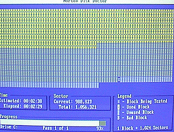 I decided it might be a good idea to run a surface scan on all of the drives, considering their age. Three of them tested correctly, but the fourth (one of two Maxtors I bought) had four bad blocks. This did not concern be since nothing I was going to do would only harm one or two blocks and would easily stand out. For the actual tests I decided to use Norton Utilities 2001 in DOS mode running continuous scans. I also had to create a new IDE ribbon cable for these tests. Normal IDE ribbon cables are only 18" long and this could have made it difficult for me to traumatize the things. So I bought some cable and made a 2.8' cable. Along with a power extension cable, I could now freely move the drives about while they were running.