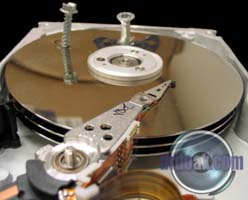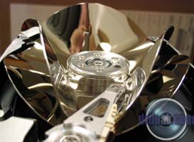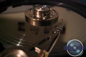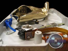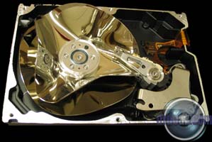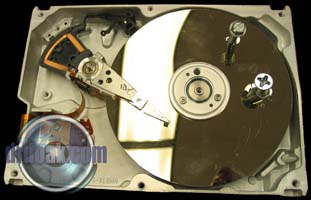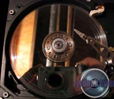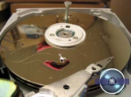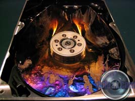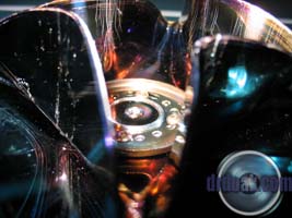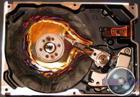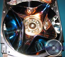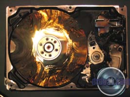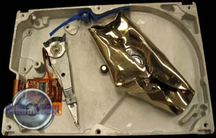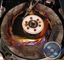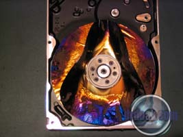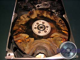 This one was partially filled with sand and then spun up a few times. You can see a series of rings etched into the metal of the platters by the silica sand.