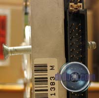 One screw all the way through. Someone decided to doodle on the surface with a nail... Three other holes drilled into the platters.