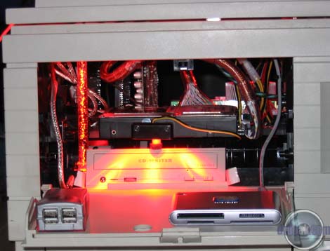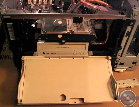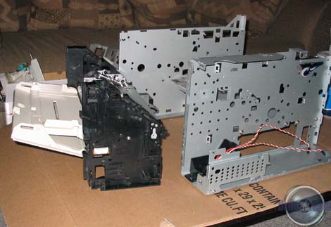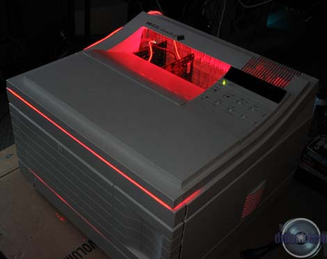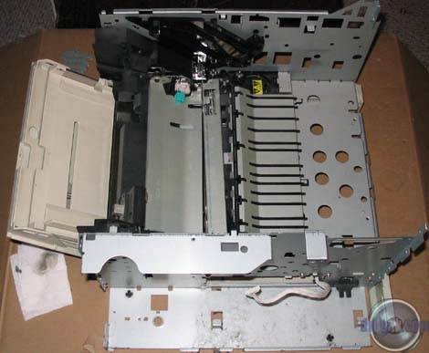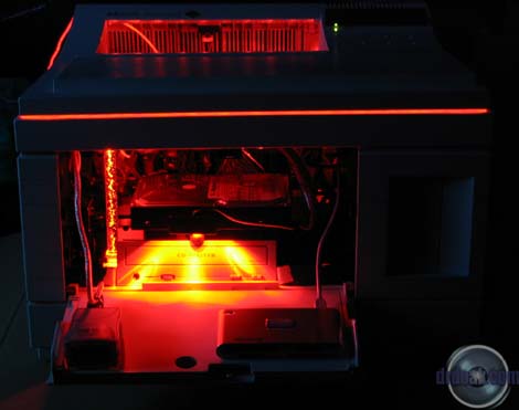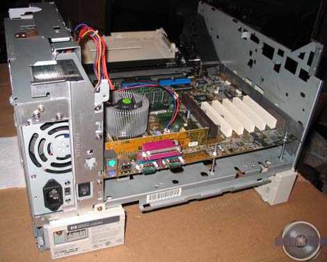 A nice change in computer stores this past year or so is their recognition of people's desires to modify their otherwise boring beige cases. Microcenter is no exception here. They have a good rack of cold cathodes, lighted fans and other neat things. I ended up spending a few dollars more than I intended, but ended up with everything I was planning on ordering online. The only thing I didn't see there were the newer liquid cold cathode florescent lights. I also ended up picking up a CD-RW and floppy drive from the returns bin. The next few days were a blur of cutting a variety of holes into some fairly heavy steel. I worked on the power supply first which involved a great deal of cutting on the back of the printer. The ATX supply just happens to fit quite well above the original (which is required for the printer's structure). I also had to cut a few screws to a shorter length. I replaced the original power switch workings with an overgrown ATX power switch. I managed to get it to work with the original rocker switch assembly, so it will still look original. In order to get the motherboard to fit in the main bay, I had to cut a slot along the left side of the printer. It turns out that the motherboard is one measly millimeter too wide for the aforementioned bay... On the plus side I got to use a composite blade on our table saw to do it that we've been storing for the last five years. I mounted the motherboard with five long bolts. After the motherboard, the next challenge I had was mounting the CD-RW drive. After much deliberation (mostly in my head) I decided to mount it through two pieces of steel and a few thick plastic parts. I always take the easy way out! Some hours later I managed to finally get the thing shoehorned in there. Rather than describe where it is, just take a look at the pictures. Almost as an afterthought, I mounted the hard drive above the CD-RW. Using some Goop glue I mounted a flash memory reader and USB 2.0 hub on the front door of the printer so that they stow away when the door is closed. Asus has some nice USB breakout cards that are meant to take up a slot on the back of a case. I used one here mounted inside the printer so that I would not have to have a mess of USB cables sticking out the back of the printer. With everything mounted, I started on the lights. I have an tube containing 12 LEDs that flash in groups of four in a variety of patterns. I put this under the lip of the paper output tray on top of the printer. As always this involved cutting more plastic... An acrylic bubble tube was placed to the side of the CD-RW drive. I had some trouble with the power supply fan which had started coming apart on me during a test run. I, of course, did not notice until 30 minutes later when I realized the side of it was extremely hot to the touch. I managed to fix the fan, but to be safe, mounted another fan on the other side of it as in intake just in case the primary PS fan fails again. This has the added benefit of making a nice red glow out the side of the printer. As a final touch I am going to affix some EL glow wire around the upper edge of the printer after I decide whether or not to paint the outer case black. |