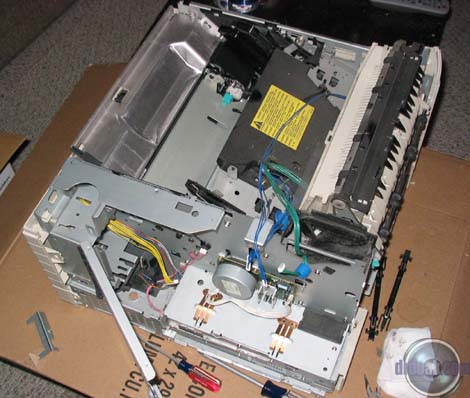 The parts had accumulated yet again, so I felt compelled to come up with another case mod. After careful consideration I decided that the perfect case for a computer is an HP Laserjet 4m. I went out in search of a cheap laser printer matching this description. It just so happens that eBay has all sorts of things that fit here, making the search much easier. Of course, the printer took three months to ship... With the late arrival of the printer I decided to get to work ASAP. The first thing I did was to start cleaning all of the plastic panels with some nice Clorox spray. Such wonderful, overpowering fumes come off of that stuff... It took me the rest of the evening to clean off the variety of black marks and remove the dust. |